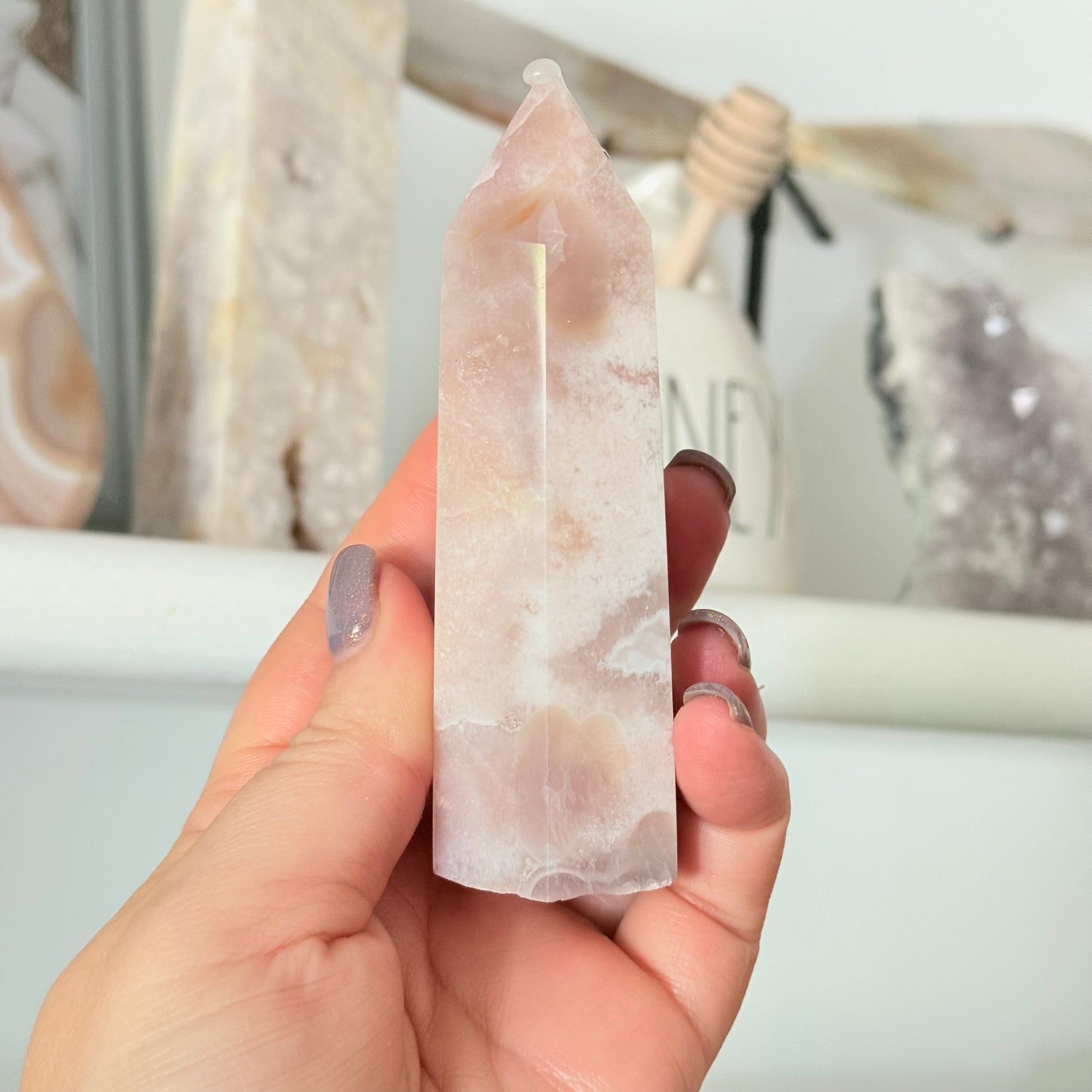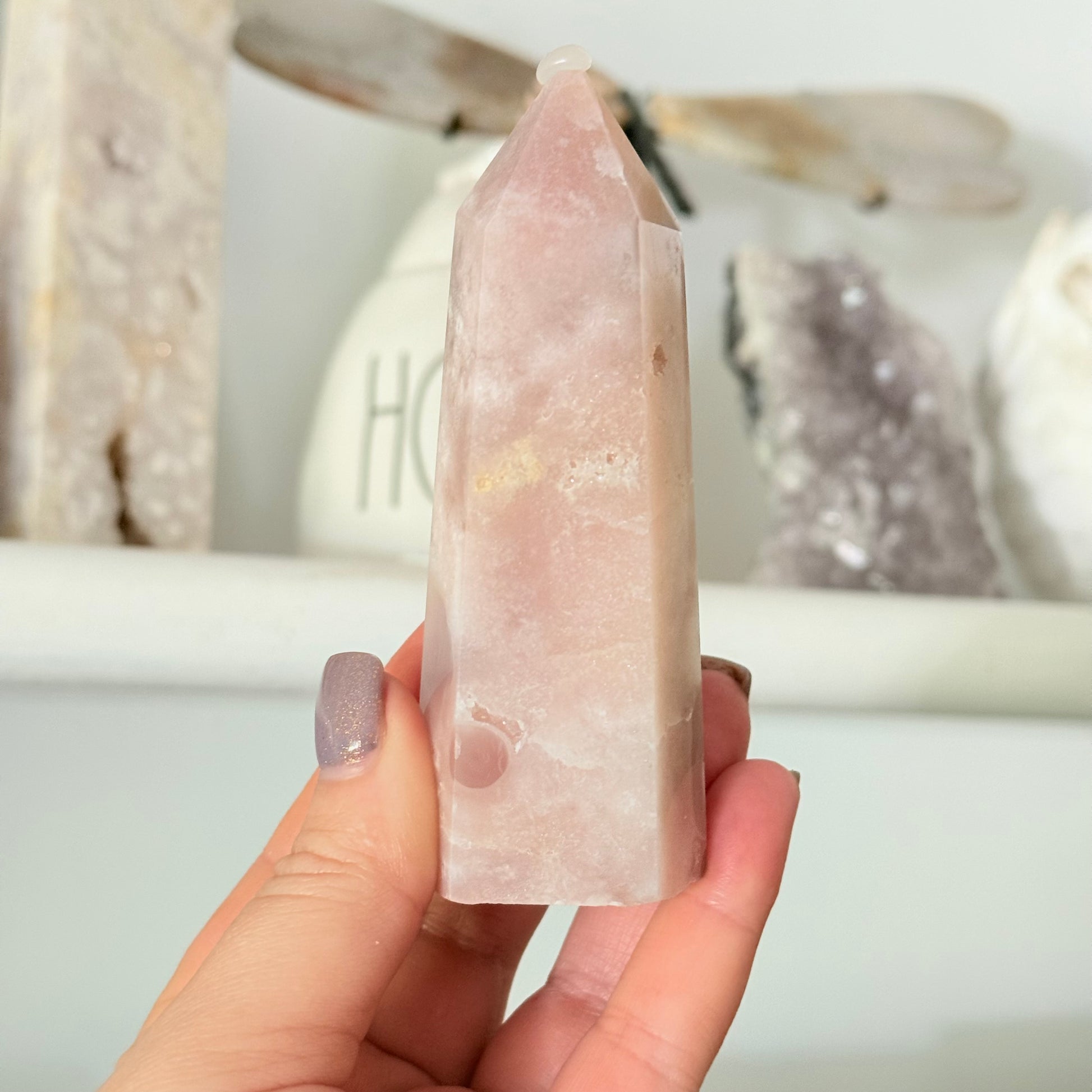 Pink Amethyst is linked with the heart and crown chakras, encouraging alignment with love, clarity, and higher wisdom. Flower Agate supports vision, authenticity, and stepping into one’s fullest potential. Together, they serve as a reminder to trust your path while staying rooted in grace.